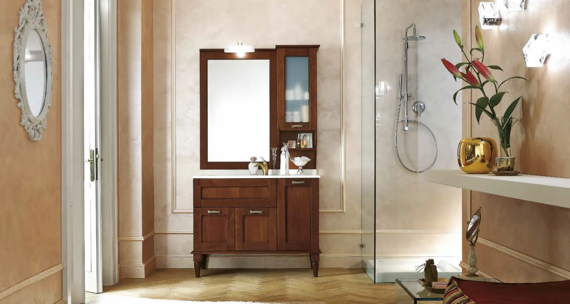 La stanza da bagno attualmente non è più solamente una stanza di servizio: alla sua progettazione viene riservata la medesima cura degli altri locali di casa. L’Arredo Bagno classico dei migliori brand garantisce al giorno d'oggi soluzioni compositive per realizzare ambienti di elevata qualità e ben arredati. Il modello di Mobile da Bagno Accademia 14 di Puntotre in legno ultima il locale mixando perfettamente doti di classe con funzionalità ed ergonomia. In showroom troverai non solo wc e bidet, ma anche tutti gli altri elementi accessori inclusi nel concept per la sala da bagno: scopri le più esclusive proposte di mobili bagno a terra. Nel nostro negozio avrai a disposizione varie proposte di composizioni di Puntotre per decorare lo spazio di casa dedicato alla cura della propria persona.
